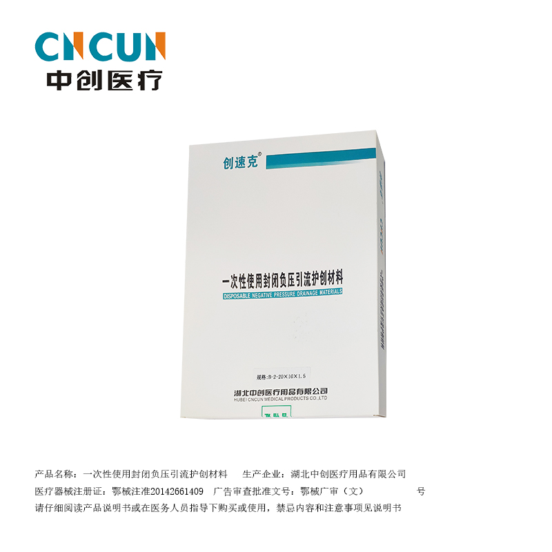 是以聚乙烯醇水化海藻盐泡沫填塞机体皮肤或软组织缺损,感染,坏死后形成的创面,充当创面与引流管之间的中介,将传统的点状引流变为全方位引流技术。它利用生物半透膜使开放性创面封闭,使用中心负压或者专用的负压机产生一定的负压,使整个于材料相接触的创面处于一个全表面封闭负压引流状态,是近年来发展起来的用于创面治疗的新技术。